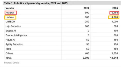 1月8日,国际机构Omdia发布2025年全球人形机器人出货量榜单,数据显示,智元以5168台登顶,宇树以 4200 台屈居第二。