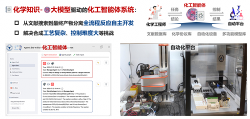 在智能化工方向,团队与化学专家合作,研发化学知识-大模型驱动的化工智能体系统,实现从文献检索到产物分离全流程反应自主开发,以解决合成工艺复杂、控制难度大等关键瓶颈。初步成果在Nature Communications上发表。