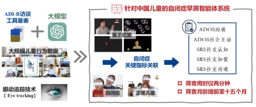 在智慧医疗方向,团队与上海新华儿童医院合作,基于上千名儿童的行为数据,研发首个针对中国儿童的自闭症早筛智能体系统。该系统筛查用时仅两分钟,并将筛查月龄提前至十五个月,为早期干预争取了宝贵时间窗口。相关成果获得中国图象图形学学会自然科学奖一等奖、ACM中国新星奖等奖励。