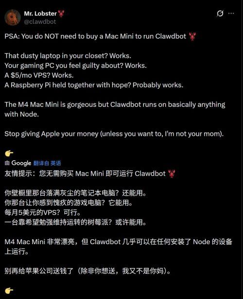 然而,运行Clawdbot并非必须使用Mac mini。项目官方很快发文降温,“别再给苹果公司送钱了,能运行Node.js的设备,都可以部署Clawdbot。”