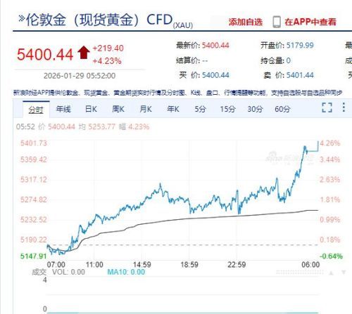 现货黄金日内涨幅扩大至4.2%,报5400美元/盎司,续创新高。