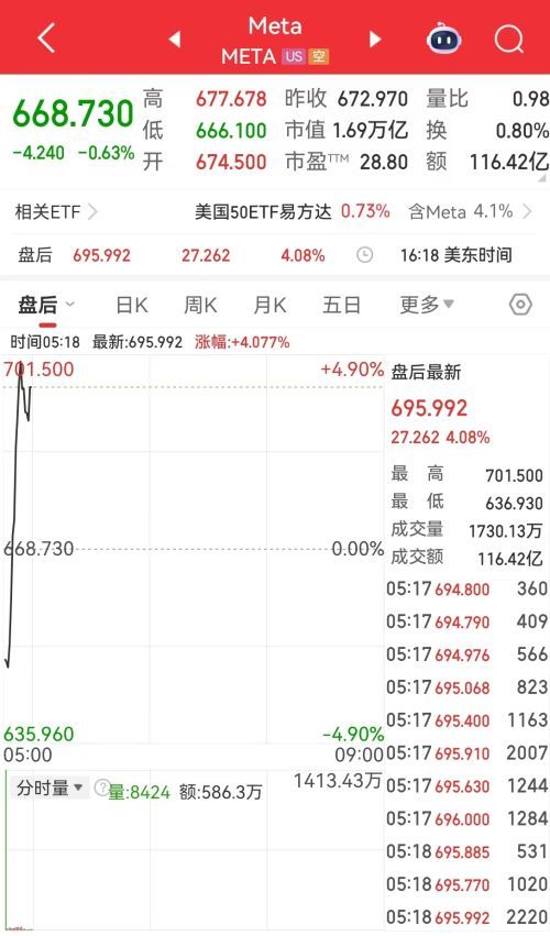 META第四季度营收598.9亿美元,同比增长24%,预估584.2亿美元;第四季度广告收入581.4亿美元,同比增长24%,预估567.9亿美元;第四季度每股收益8.88美元,上年同期8.02美元;第四季度经营利润247.5亿美元,同比增长5.9%。META盘后涨超4%