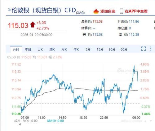 现货白银报115.03美元/盎司,盘中一度涨超4%。