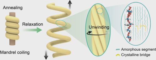 研究团队发现,在高温长时间的退火过程中,聚合物分子链的运动性增强,纤维内部积累的应力得以充分释放。这一过程有效抑制了纤维从芯轴上取下后过度解捻的趋势,从而“锁定”了高捻度,并自发形成了大而稳定的初始螺旋节距。