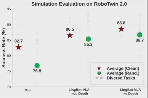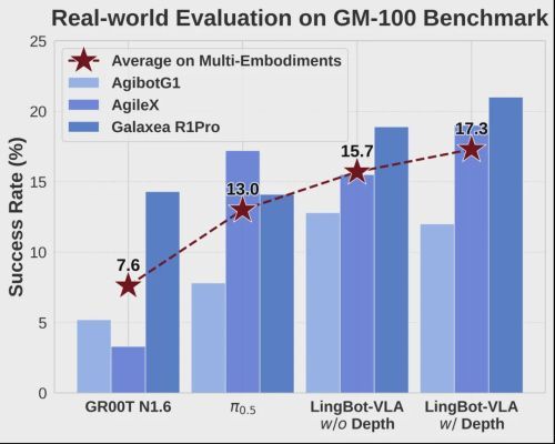 在上海交通大学开源的GM-100真实机器人评测基准中,引入深度信息的LingBot-VLA平均成功率达 17.3%,超越此前公认最强的Pi0.5。