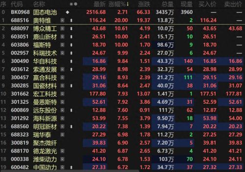 2月3日早间,电池及固态电池板块盘中一同走高,固态电池指数盘中一度涨逾2%。个股方面,奥特维盘中20CM涨停,鹿山新材、科瑞技术、福斯特盘中同样一同封死涨停板,华自科技等多股涨逾9%。