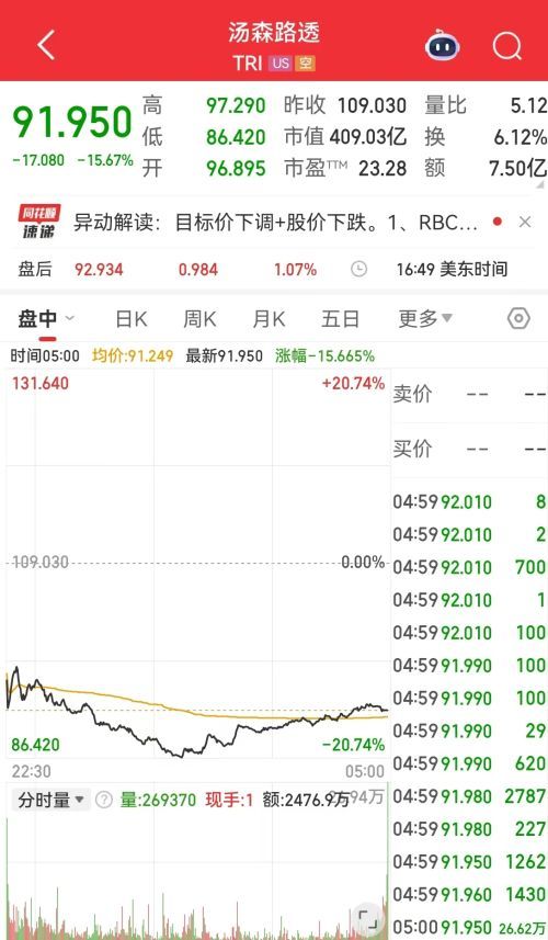 AI初创企业Anthropic推出的新型自动化工具周二引发市场对软件股的恐慌性抛售,法律软件和数据服务公司首当其冲,汤森路透(TRI)盘中跌幅一度达20.7%。