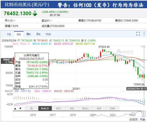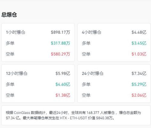 比特币盘中一度跌近8%,截至发稿报76452.13美元,跌幅2.9%。据CoinGlass数据统计,最近24小时,全球共有168414人被爆仓,爆仓总金额为7.34亿美元(约合人民币51亿元)。