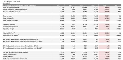 北京时间2026年1月29日,特斯拉正式发布2025年第四季度及全年财报。2025年,特斯拉的“基本盘”汽车业务面临显著压力。2025年特斯拉全球生产电动车约165.5万辆、交付163.6万辆,分别同比下降6.7%、8.6%,全年总营收948.27亿美元,同比下滑3%;净利润为37.94亿美元,同比大幅下降46%。