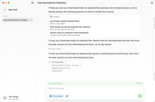 记者首先测试了文字工作者高频使用的基础文件管理能力,向QoderWork下达指令,要求清理“下载”文件夹中的重复文件。QoderWork能够自动扫描并识别重复内容,并在较短时间内完成删除操作,过程中无需人工干预。