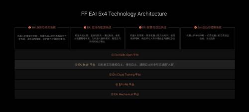 EAI 5x4技术架构则由四大技术系统与五大技术平台构成。四大系统包括身体与结构、驱动与能源、智慧与交互、运动与控制;五大平台则分为Skills Open、Brain、Cloud Training、HW、Mechanical。据悉,该技术架构源于FF在汽车领域多年的技术积淀,与具身智能机器人的核心需求相契合,能够实现技术复用与升级,是FF跨界的底气之一。
