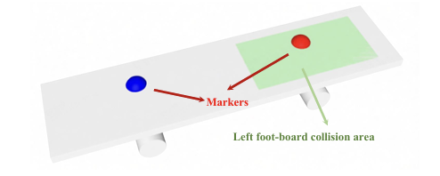 上图展示了机器人蹬地后,将脚抬起并准确落在滑板上的过程,随后旋转身体调整姿态。这与人类滑板的逻辑完全一致 。同时,为了保证安全和训练效果,研究人员在仿真环境中设置了精确的碰撞检测区域。