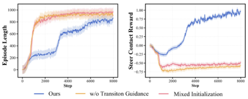 (a) 是否建模的区别: 红线显示,如果忽略滑板的物理耦合(w/o modeling),滑板只能走直线,无法转向;蓝线(Ours)则展示了丰富的转向能力 。(b) 是否有倾斜引导的区别: 即便有了模型,如果单纯靠强化学习自己摸索(橙色区域),机器人能覆盖的转向范围很窄。而引入物理引导的倾斜策略后(蓝色区域),机器人的转向范围和精度都大幅提升。训练效率与动作质量。下图的左图是回合长度,右图是转向时的接触奖励。