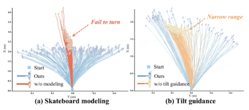 (a) 左侧: 展示了人-板系统的物理耦合关系。(b) 右侧: 详细展示了三个阶段的控制策略:1. AMP for Pushing Style (绿色区域): 在蹬地阶段,引入了“对抗动作先验”(AMP),利用人类滑板的动作数据训练判别器,让机器人的蹬地动作既有效又像人,而不是机械地瞎踢。2. Trajectory Planning Transition (粉色区域): 过渡阶段是最危险的。系统使用了贝塞尔曲线(Bézier curve)和球面线性插值(SLERP)来规划上板和下板的轨迹,确保平滑切换。3. Physics-Guided Steering (蓝色区域): 在滑行阶段,利用图2推导出的物理公式,计算出目标航向所需的板面倾角,引导机器人做出正确的倾斜动作。理论很丰满,现实骨感吗?研究团队进行了大量的对比实验。转向能力的提升。如果没有物理模型的指导,机器人能学会转弯吗?