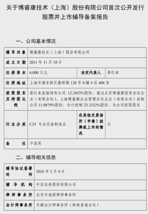 2026年2月,上海证监局IPO辅导备案系统迎来一家备受瞩目的公司——博睿康技术(上海)股份有限公司。这家专注于脑机接口技术的高科技企业正式启动科创板上市进程,由中信证券担任辅导机构。
