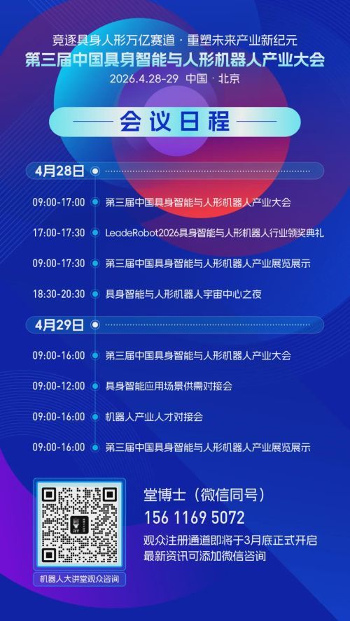 在此背景下,推动产业从技术示范迈向批量交付,已成为全行业的共同课题。为凝聚共识、促进协作,“第三届中国具身智能与人形机器人产业大会”将于2026年4月在北京举行。本届大会由立德机器人平台(机器人大讲堂)发起,旨在搭建高水平对话平台,聚集全球产业、学术与供应链关键力量,共同解答产业规模化命题。