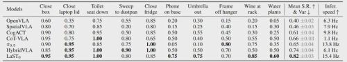 在RLBench仿真基准测试中,LaST₀在10项任务上的平均成功率高达 82%,显著超越了之前的顶尖模型。更惊人的是效率:其整体推理速度达到 15.4 Hz,而基于显式语言CoT的对比方法仅为 1.1 Hz,速度提升近14倍,时空理解能力卓越。