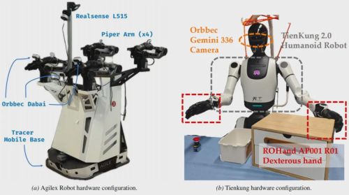 Agilex 移动操作任务和天宫灵巧⼿操作任务的机器⼈实验设置