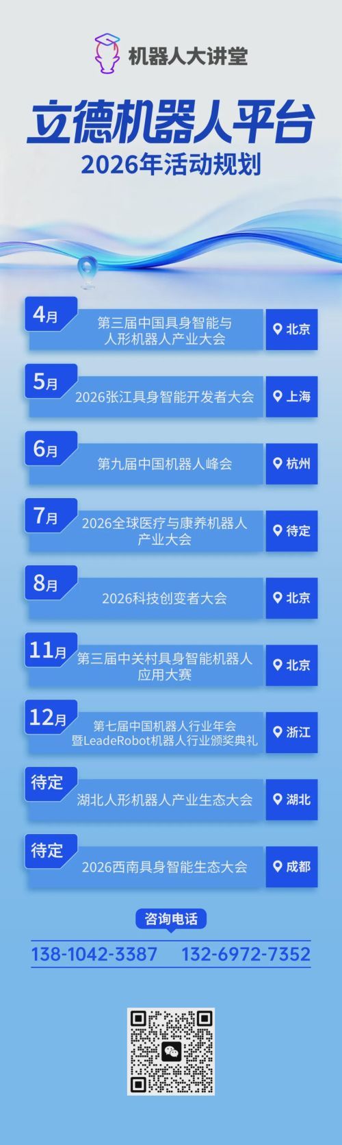 站在新的产业风口,立德机器人平台重磅推出2026 年度活动规划。全年9大核心活动贯穿南北,覆盖人形机器人、具身智能、医疗康养、工业制造等关键赛道,以“会议+展览+评选+赛事” 的多元模式,搭建政产学研投一体化交流合作平台,助力产业伙伴抢占发展先机,共赴智能时代的黄金盛宴!