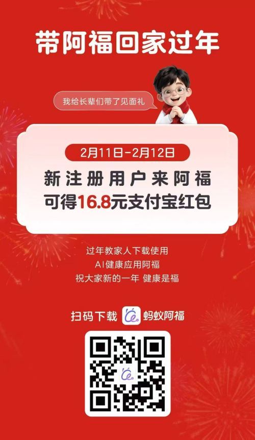 值得一提的是,蚂蚁阿福今日还推出一项新引流活动,2月11日至2月12日期间的新注册用户,可获得16.8元的支付宝红包,进一步吸引未注册用户参与,关注AI健康服务,抢抓春节节日流量。
