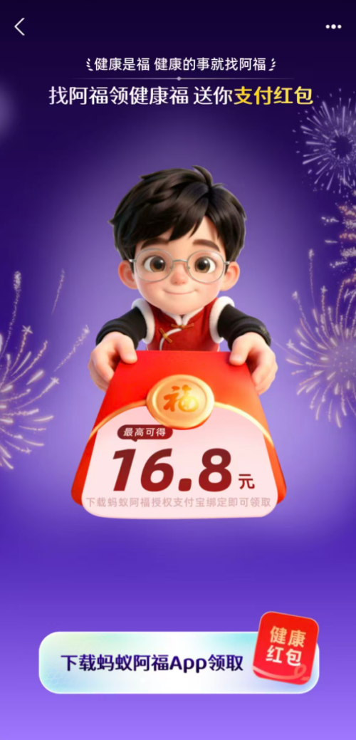 作为支付宝2026年集五福活动的核心新增板块,“健康福”已于2月3日正式上线,成为今年集福活动的一大亮点。活动期间(持续至除夕夜),用户在支付宝五福页面点击“健康红包”入口,下载或跳转至蚂蚁阿福APP完成登录,即可领取最高16.8元的随机现金红包,红包实时发放至绑定支付宝账户,7天内可用于线下消费抵扣。