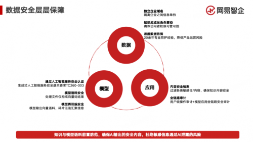 为了解决企业决策者对于知识安全的顾虑,网易智企-云商通过“数据-模型-应用”三层防护体系确保企业知识安全,让企业无忧拥抱AI。