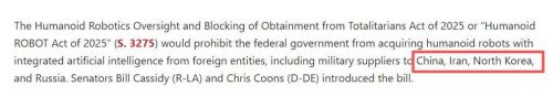 更具针对性的,则是同日提出的《2025年人形机器人监管及阻止从极权国家获取法案》(简称“2025年人形机器人法案”,S. 3275)。该法案由路易斯安那州共和党参议员比尔·卡西迪与特拉华州民主党参议员克里斯·库恩斯联合发起,明确禁止联邦政府从“外国实体”采购集成人工智能的人形机器人,而所谓“外国实体”直接点名中国、伊朗、朝鲜和俄罗斯。