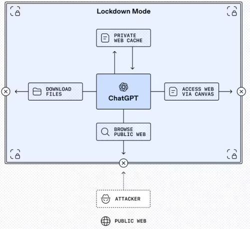 此次推出的首个防护措施是Lockdown Mode(锁定模式),这是面向高安全需求用户的可选高级设置,并非面向普通用户,核心通过严格限制 ChatGPT 与外部系统的交互方式降低数据外泄风险。该模式会确定性禁用或限制易被利用的工具能力,比如网页浏览仅可访问缓存内容,无强安全保证的功能将直接禁用。