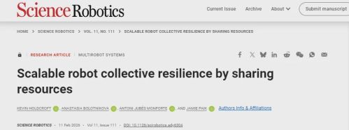 这项成果以"Scalable robot collective resilience by sharing resources"为题,于2026年2月11日发表在国际顶级期刊Science Robotics上。