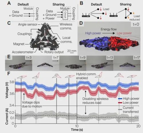 在电力共享方面,团队开发了一种新型电路,能够通过模块间原本用于数据传输的电气触点同时传输电力,无需对机械结构做任何改动。电力传输的核心原理很直观:电流大小与两个模块之间的电压差成正比(实测比例系数为1.440ΔV),高电量模块自动向低电量模块输送能量。由于传输量随电压差缩小而自然减弱,系统天然具备抗振荡特性。同时,电流被限制在0.5A以内,防止电气触点过载或电池过充。