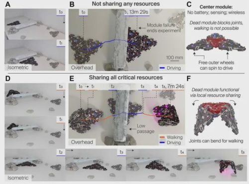 先看没有资源共享的对照实验。中心模块"死"了之后,邻居无法向它供电、无法与它交换传感数据、也无法协调关节运动。三脚架结构失去了行走能力——因为行走需要所有四个模块同步控制关节,而一个不响应的模块会导致关节撕裂或运动失败。三个存活模块只能退而求其次,用外侧的轮子在地面上缓慢滑行。这种运动方式不仅慢,而且更耗电。最终,在持续运行809秒后,一个模块电量耗尽不断重启,整个集体未能通过桥下的低矮通道,任务失败