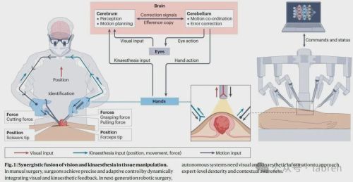 图 1. 组织操纵中的视觉-动觉协同融合。在手动手术中,外科医生通过动态整合视觉和动觉反馈来实现精确和自适应控制。在下一代机器人手术中,自主系统需要视觉和动觉信息来达到专家级的灵活性和情境意识。