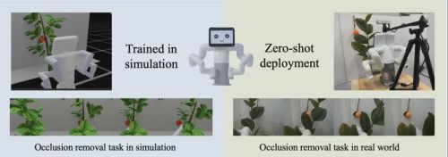 该研究聚焦于复杂且杂乱的农业环境中机器人操作所面临的挑战,特别是针对水果定位和遮挡解决的任务。研究团队利用双臂半人形机器人myBuddy 280,开发了一个能够与可变形植物灵活交互的端到端深度强化学习(RL)框架。该方法使机器人能够通过学习操纵枝叶来发现隐藏的水果,而无需精确的几何建模。该研究展示了农业机器人自动化方面的显著进步,为可扩展的、感知驱动的解决方案铺平了道路,这些解决方案能够在动态且不可预测的环境中有效运行,从而提高农业部门的生产力和效率。