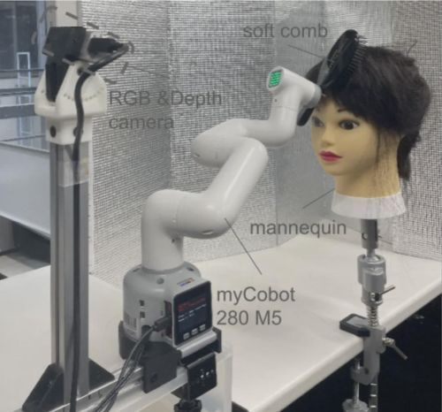 该研究介绍了一种机器人前发造型系统,该系统通过图像比对当前与目标发型方向图,提取发根中心目标发束并生成梳发轨迹,以高精度再现目标发型。该系统采用协作机械臂myCobot 280 M5构建,能够实现稳定的3D轨迹执行和可重复的精细头发束操作。为机器人发型调整系统提供了可扩展的视觉-运动协同技术路径,将推动机器人服务和美容领域等新兴应用。