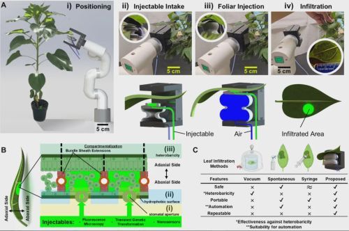 该研究由康奈尔大学团队完成,聚焦精准农业痛点——传统叶面注射易损伤叶片、适配性差、一致性低等问题,创新研发软体机器人叶片夹持器,通过myCobot机械臂,实现自动化压印加压渗透,将纳米颗粒与遗传物质精准注入叶片,成功率超91%且损伤极小,实现了可靠的体内表型分析和基因表达研究,从而推动植物生物工程与高通量表型分析的技术革新。