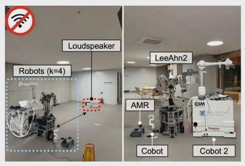 通过多种异构机器人(包括自主移动机器人myAGV和协作机械臂myCobot 280 Pi)进行验证,作为接收器机器人通过声学通道接收并执行命令。该方法无需依赖WiFi或蓝牙网络,且对噪声和环境干扰具有鲁棒性。在一对一、一对二和一对多配置下,实验结果表明,在距离高达4米的范围内,通信准确率超过97.5%,在强噪声条件下依然表现稳定可靠。该方法为无网络环境下异构机器人群体的协同作业提供了一种低成本、易部署的通信解决方案。