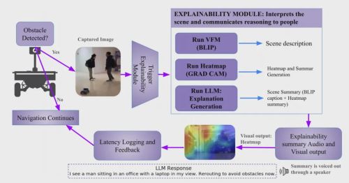 该研究针对自主移动机器人在社交环境中因决策不透明导致人机信任度低的问题,提出了一种多模态可解释性框架,该框架整合了视觉语言模型(VLM)和热图可视化技术,通过ROS2节点实现实时环境感知与行为解释,以提高机器人导航过程中的透明度。该系统在myAGV上进行了手动和自主导航测试,开发了一个可解释性模块,用于检测社交冲突、生成视觉推理提示并提供自然语言解释。