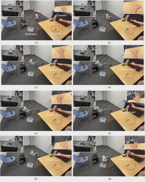 该研究针对复杂机器人系统遥操作中动态手势交互的精确性与实时性需求,提出了一种基于动态手势的人机交互系统。系统通过Depth-MediaPipe框架精确提取手部骨骼关键点的三维坐标,并利用Semantic-Pose-to-Motion模型解析手势的语义与姿态信息,实时转换为对四足机器人移动、机械臂末端执行器跟踪及基于语义的命令切换等机械动作。实验在Unitree Go1四足机器人及myCobot 280机械臂上进行,结果显示:系统能够实现直观、精确的实时交互控制,平均推理延迟为29.77毫秒,抓取任务成功率达86.7%,该技术在从物流到远程医疗的广泛应用中具有巨大潜力,为复杂机器人平台的直观、实时遥操作提供了一种有效的解决方案。
