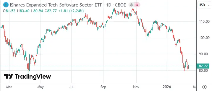 近期,市场担心Anthropic推出的Claude Cowork等先进AI工具将颠覆软件行业的商业模式,相关股票大幅下跌。iShares扩展科技软件行业ETF(IGV)年内已累跌21.53%,半导体股却因算力需求而大涨。
