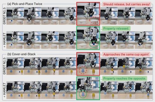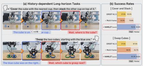 举个例子,“用最近的杯子盖住方块,再把另一个杯子叠上去”这个任务,当机器人用第一个杯子盖住方块后,方块就被遮挡住了。如果没有历史记忆,机器人看着眼前的两个杯子,根本不知道哪个杯子下面藏着方块,大概率会重复抓取同一个杯子。论文里的实验也印证了这一点:GR00T N1.5在这个任务上的成功率只有37.5%,甚至会出现“拿起杯子又放下,反复横跳”的滑稽场面。