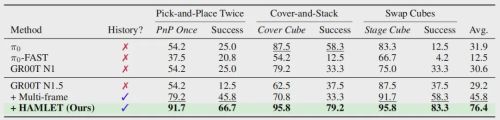 这意味着,HAMLET的记忆模块学到的不是某个特定任务的历史规律,而是一种通用的“历史信息处理能力”。未来只要在一个数据集上训练好记忆模块,就能直接用到其他机器人操控任务中,大大降低了部署成本。