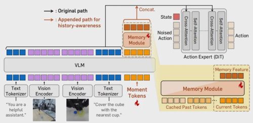 机器人伸手去拿桌上的杯子,它需要知道自己刚才有没有抓住过这个杯子吗?答案是肯定的。但现有的视觉-语言-动作模型(VLA)大多只盯着当前画面做决策,完全没有“历史记忆”。这就导致机器人在处理遮挡物体、多步骤堆叠这类需要上下文的任务时,很容易陷入混乱。