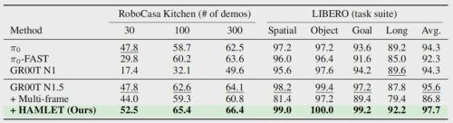 即便是在通用仿真基准测试中,HAMLET也展现出了强大的泛化能力:在RoboCasa Kitchen数据集上,它把成功率从64.1%提升到66.4%;在LIBERO数据集上,更是将行业领先的95.6%成功率推高到97.7%。