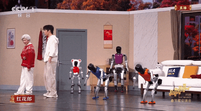 机器人是今晚的重头戏,也是春晚史上,机器人表演阵容最庞大的一次。继开场表演和明星合唱后,接下来的三个节目(包含小品、歌舞、动作类)均有国产人形机器人参与,展现的不止是机器人精准的运动控制能力,还有自然交互能力。