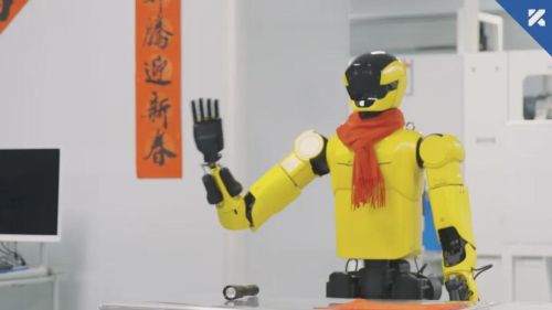 另一边,开普勒K2大黄蜂则稍显“特立独行”。城市灯火中,它正忙着贴春联,在大楼巡逻,守着工厂产线,在春节的烟火气里持续作业,似乎与过去的每一个工作日并无二致,以最朴素的方式深耕人形机器人的产业需求。