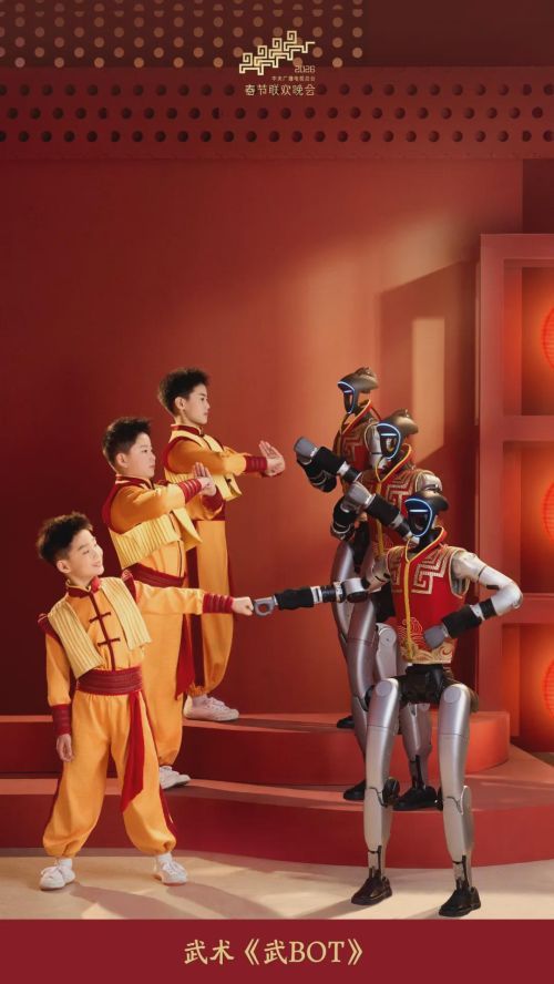 宇树科技携手河南塔沟武术学校带来武术节目《武BOT》,图片来源:中央广播电视总台《2026年春节联欢晚会》