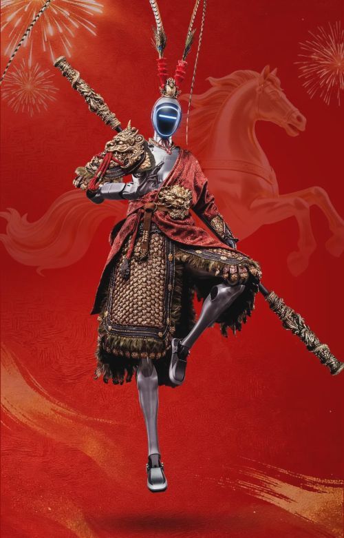 与此同时,千里之外的义乌分会场上,H2身披大圣重甲、手持金箍棒,脚踏由B2W机器狗扮演的“筋斗云”穿梭于街巷之间,最终从天而降,落于巨蛋剧场,与传统文化深度交融。