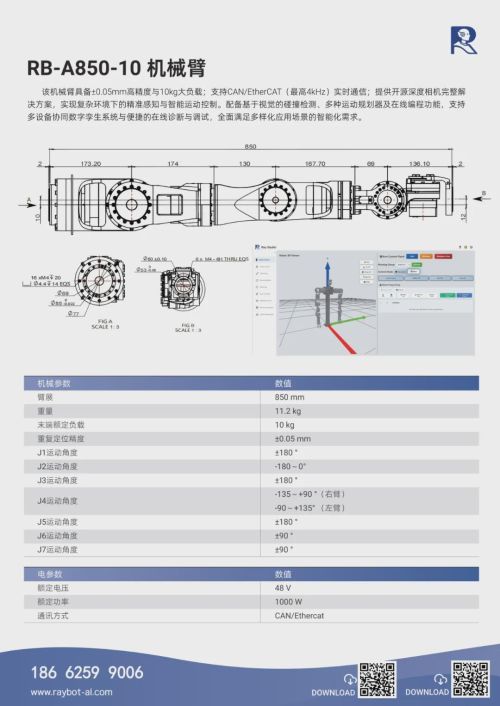 RB-A850-10以工业级的精度、开放的接口和完整的智能开发生态,成为最适合具身智能落地、机器人学习算法研究的理想平台。
