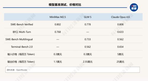 从模型路由平台OpenRouter给出的数据来看,MiniMax M2.5和智谱GLM-5相比Claude Opus 4.6具备显著的成本优势:在输入环节,MiniMax M2.5与GLM-5的价格均为0.3美元/百万Token,而Claude Opus 4.6则高达5美元/百万Token,是前两者的约16.7倍;在输出环节,MiniMax M2.5的价格为1.1美元/百万Token,GLM-5为2.55美元/百万Token,而Claude Opus 4.6的输出价格达25美元/百万Token,分别是MiniMax M2.5的约22.7倍和GLM-5的约9.8倍。