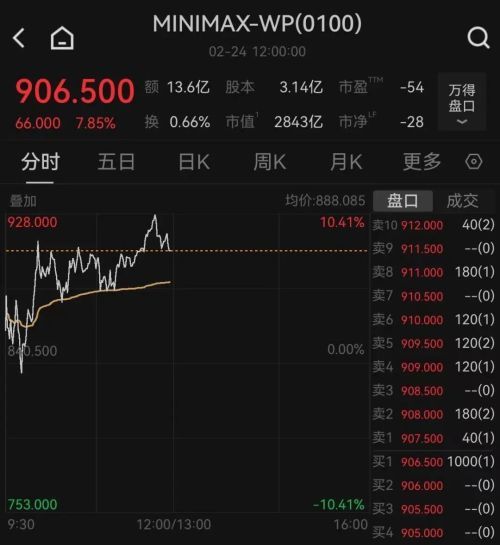 2月24日,港股大模型概念股持续走高,截至午盘,智谱涨20.89%,总市值3018亿港元;MiniMax涨7.85%,总市值2843亿港元。